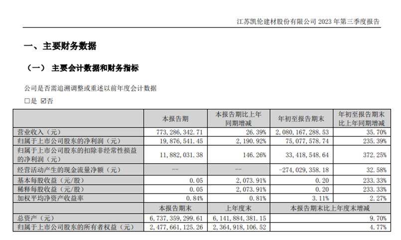 其中第三季度,凯伦股份单季营收7.73亿元,归母净利润1987.65万元,同比增长2190.92%,扣非净利润1188.2万元,同比增长146.26%。