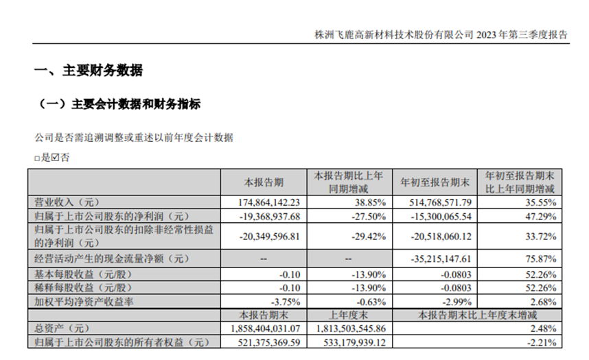 10月26日,飞鹿股份发布三季度业绩公告称,今年前三季度营收约5.15亿元,同比增加35.55%;归属于上市公司股东的净利润亏损约1530万元,同比增加47.29%;基本每股收益亏损0.0803元。